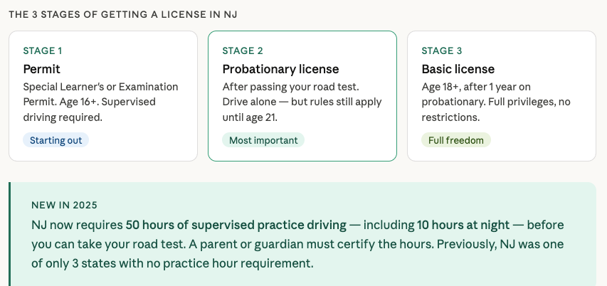 🆕 Practice Hours Requirement - New Jersey now requires: 50 hours of practice driving + least 10 hours at night. A parent or guardian must confirm these hours before you can take the road test.